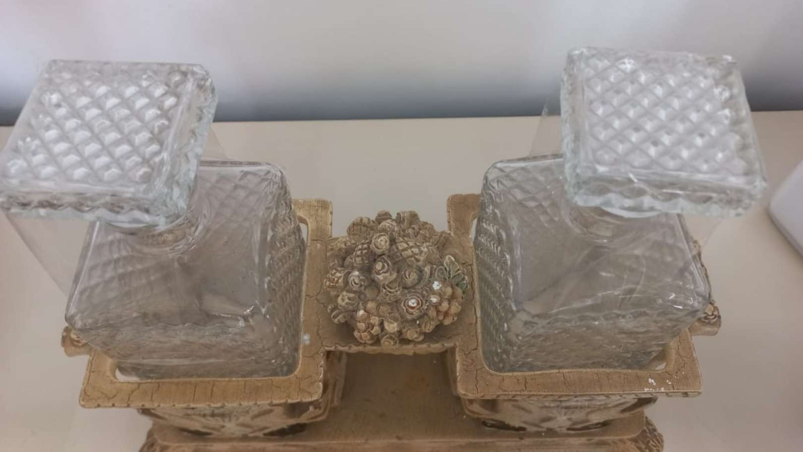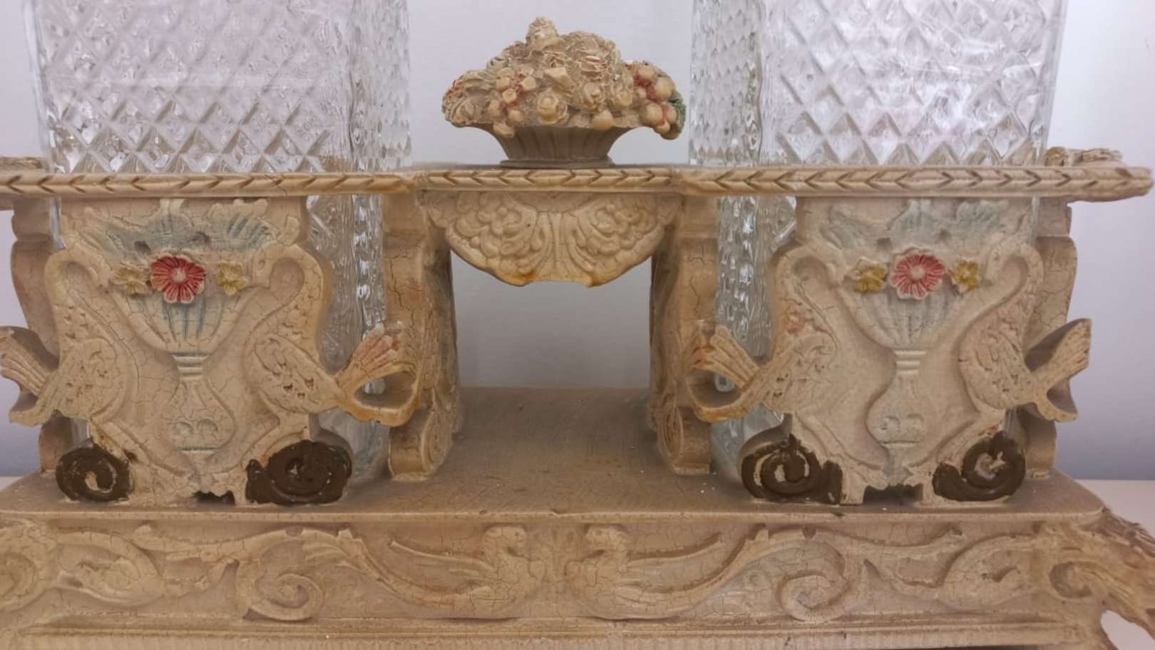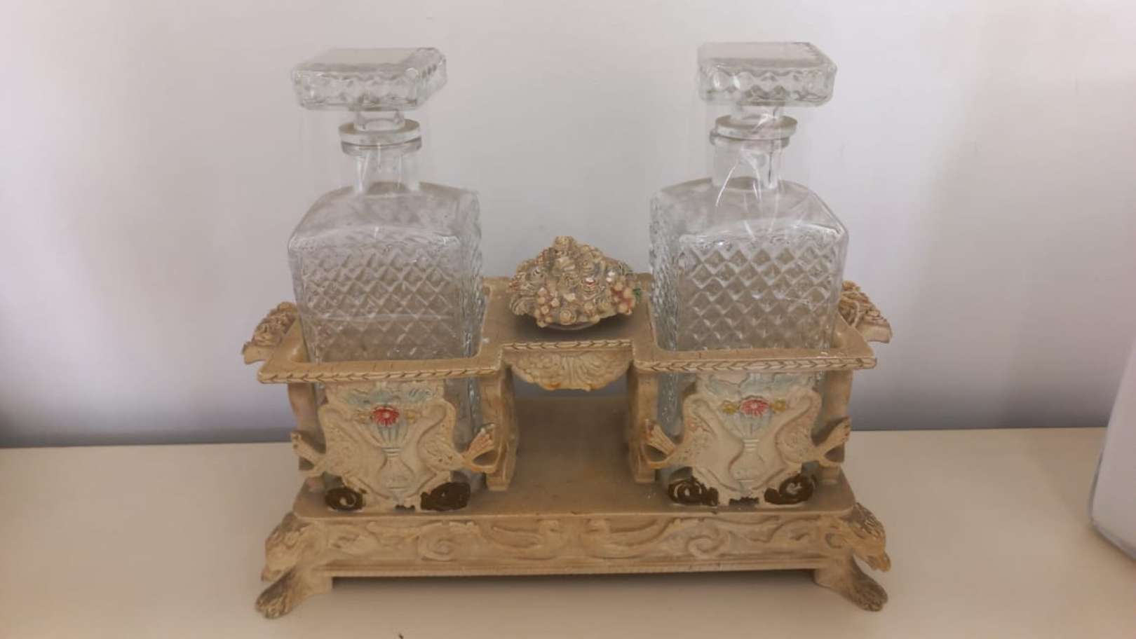 Licoreira em Cristal Europeu, anos 50, com rica decoração em dourado e vermelho e tampa. Em perfeito estado. 37 cm al...