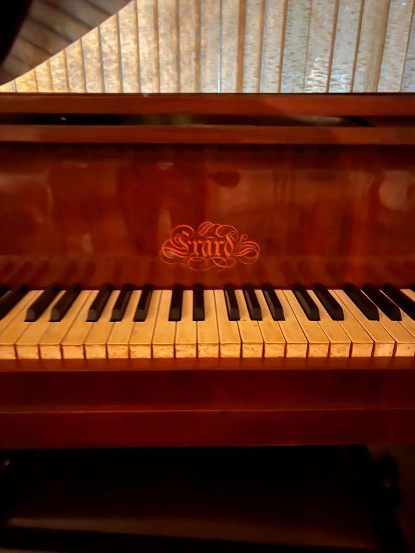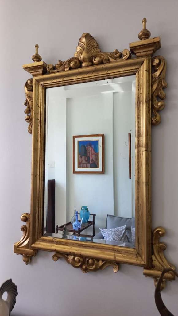 Grande espelho bisotado de madeira nobre, com moldura ricamente em volutas e pinhas, trabalhadas em folha de ouro.