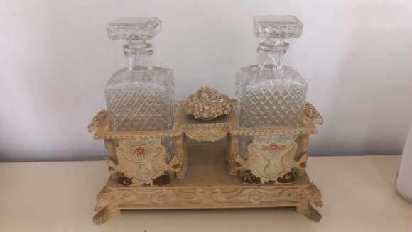 Par de Garrafas de vidro europeu, com suporte em bronze doré e rico trabalho de escultura em relevo, com imagens de â...