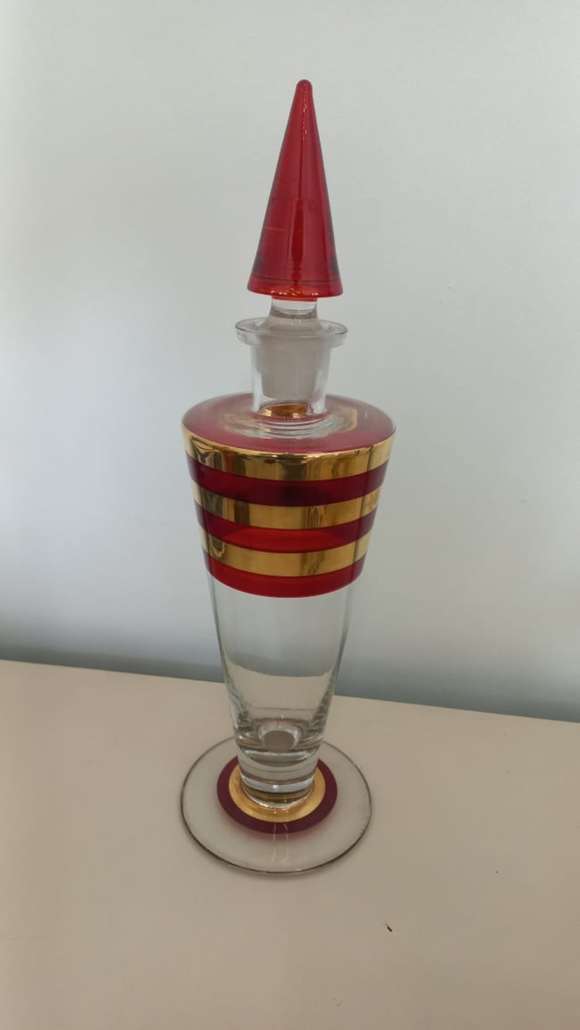 Licoreira em Cristal Europeu, anos 50, com rica decoração em dourado e vermelho e tampa. Em perfeito estado. 37 cm al...