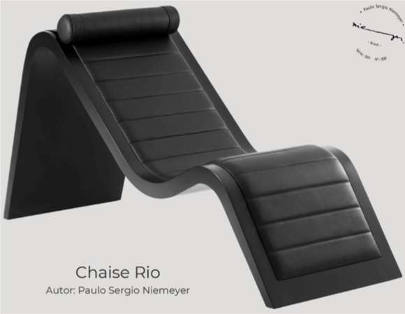 Chaise Rio. Estrutura em Eucalipto Rosa e reforços estruturais em aço. Estofamento em couro sintético preto. Design: ...