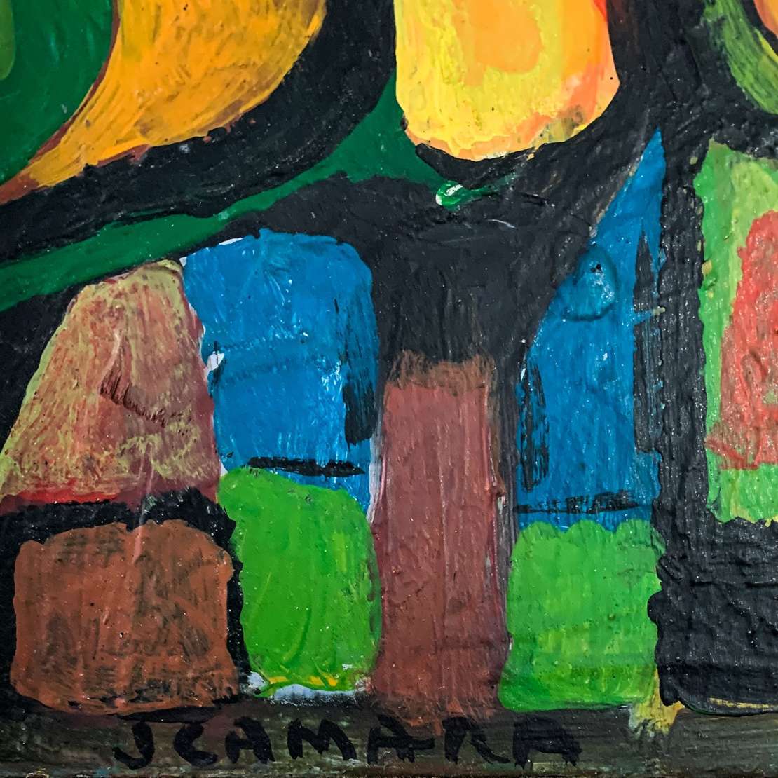 Óleo sobre Madeira. Assinado: C.I.D. Com cachet da Tenreiro Móveis e Decorações Ltda.